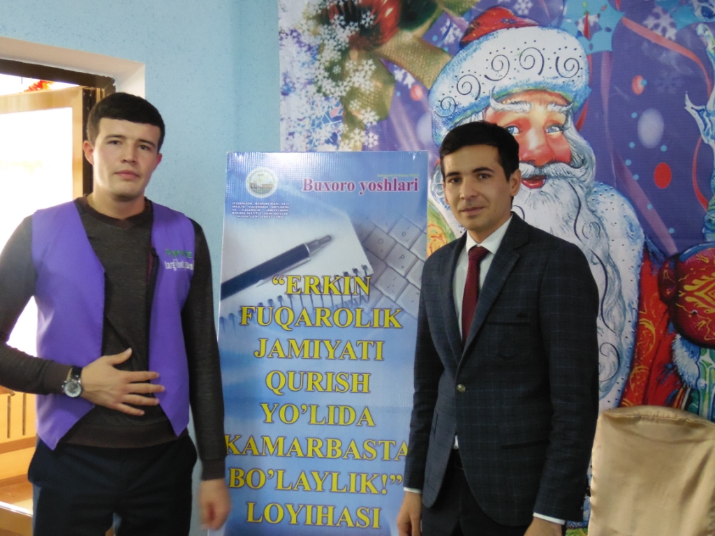 Бухоро вилояти ҳокимлиги, Ўзбекистон Республикаси Олий Мажлиси ҳузуридаги нодавлат нотижорат ташкилотлари ҳамда фуқаролик жамиятининг бошқа институтларини қўллаб-қувватлаш жамоат фонди, Ҳаракатнинг вилоят Кенгаши муассислигидаги “Бухоро ёшлари” газетаси ҳамда Бухоро шаҳар ҳокимлиги Маданият ва спорт ишлари бўлими ҳамкорлигида Янги йил муносабати билан Бухоро шаҳридаги 32-Меҳрибонлик Уйида “Эркин фуқаролик жамияти қуриш йўлида камарбаста бўлайлик!” номли давлат гранти маблағлари асосида маданий-маърифий тадбир ўтказилди.