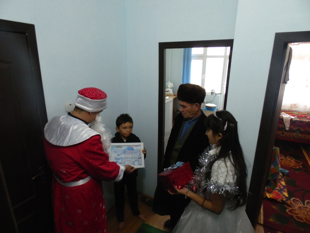 Шундан сўнг маънавий-маърифий тадбир ташкилотчилари Ўзбекистон Республикаси Вазирлар Маҳкамасининг 2010 йил 2 августдаги 164-сонли Қарори ҳамда “Етим ва ота-она қарамоғидан маҳрум бўлган болаларни турар жойлар билан таъминлаш тўғрисида”ги Низомга асосан, Меҳрибонлик Уйида тарбияланган, айни пайтда давлатимиз томонидан уй-жой билан таъминланган ёш оилалар хонадонларига бўлишиб, байрам совғаларини улашишди.